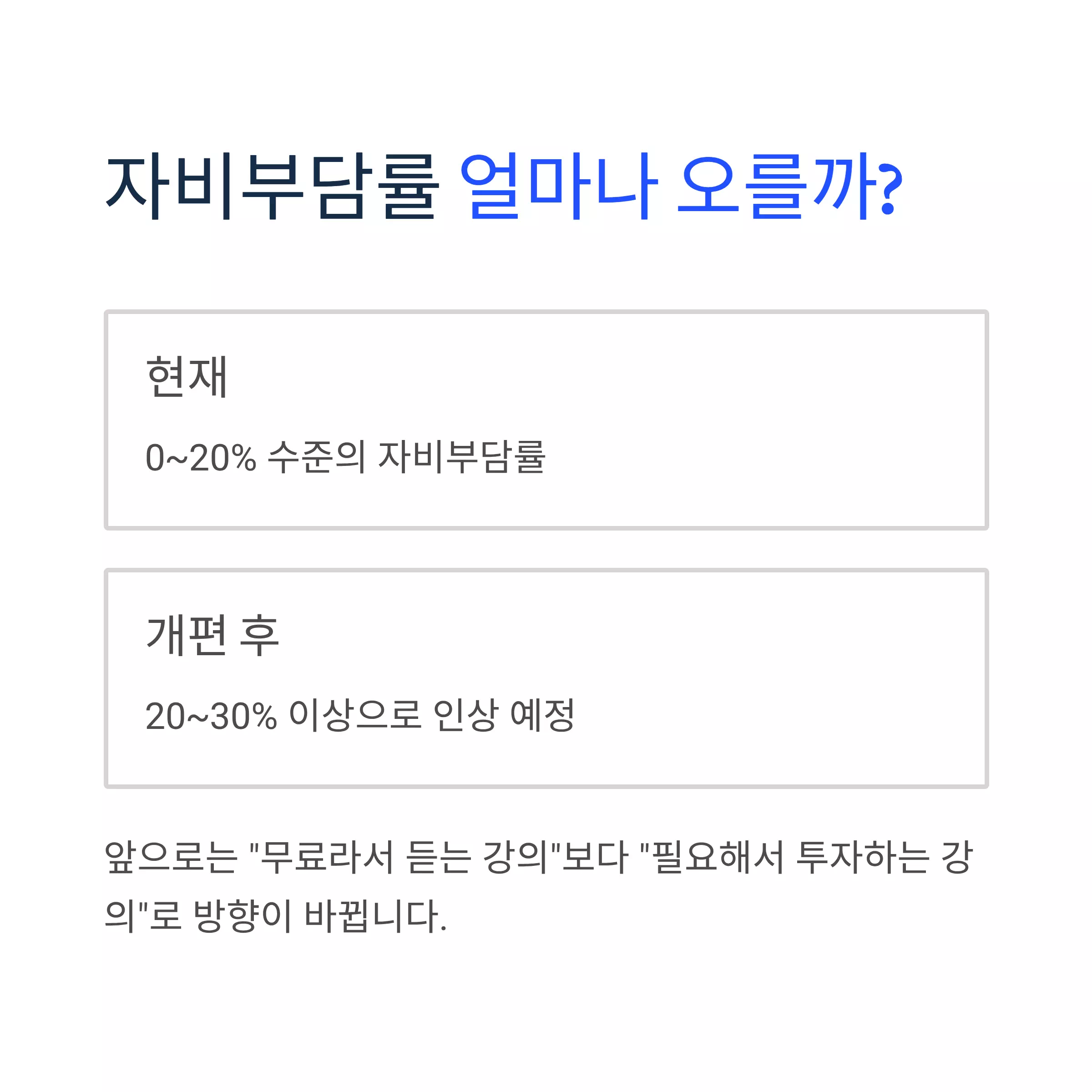 현행 0~20% 수준에서 20~30% 이상으로 인상될 가능성이 큽니다. 과정 특성과 비용에 따라 차등 적용될 수 있습니다.