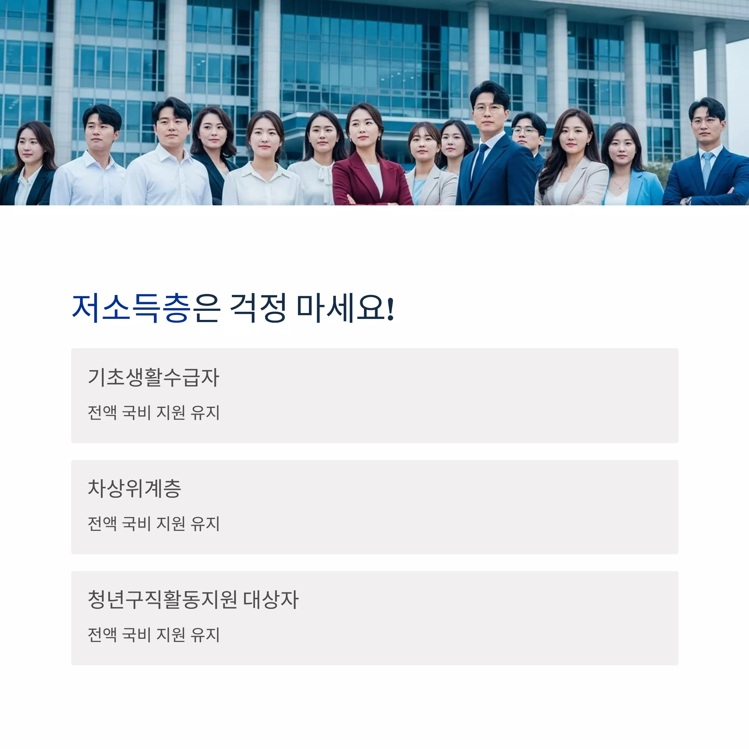 | 저소득층 지원 | 전액 국비 지원 | 전액 국비 지원 유지 |