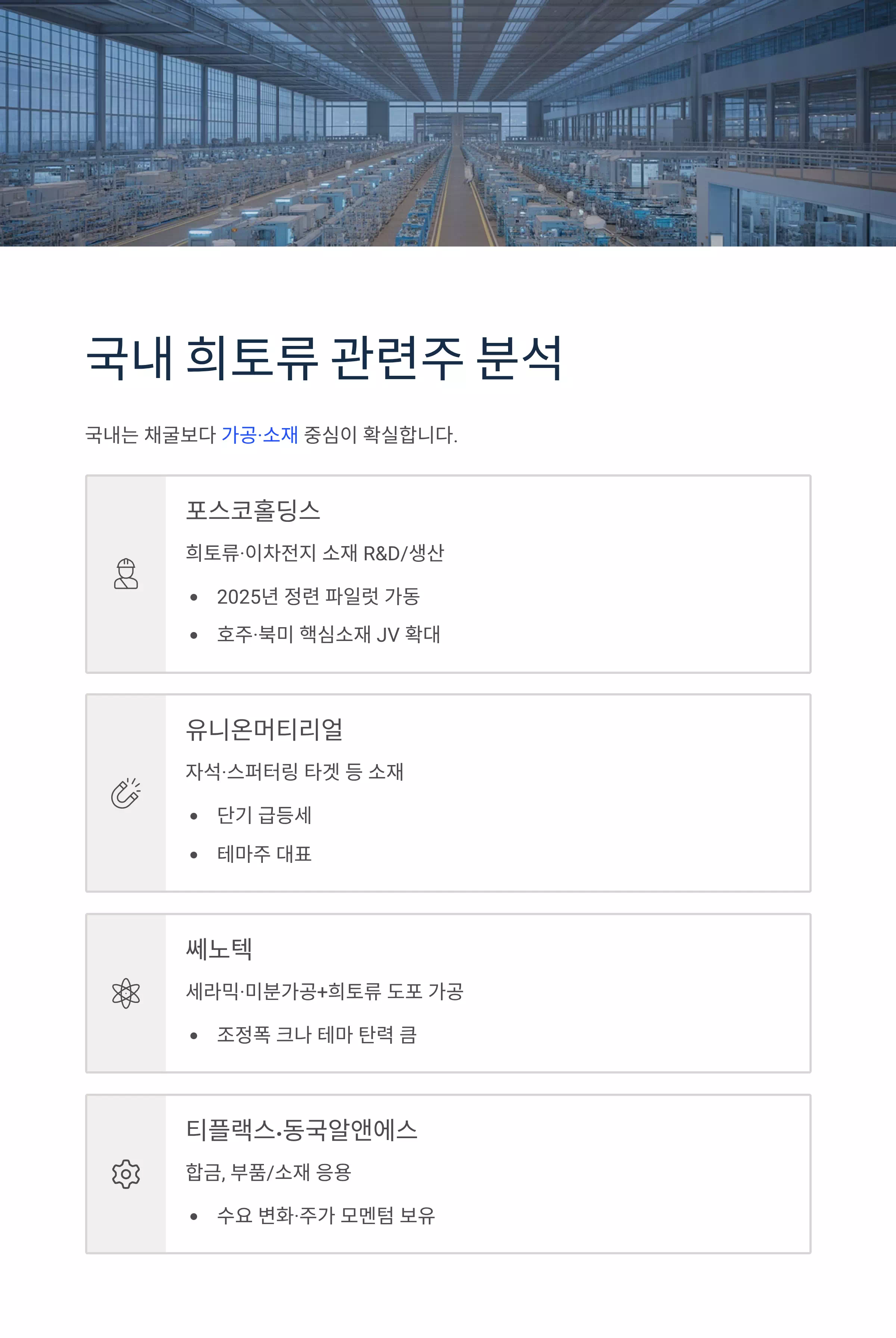 | 포스코홀딩스 | 희토류·이차전지 소재 R&D/생산 | 2025년 정련 파일럿 가동, JV확대 |