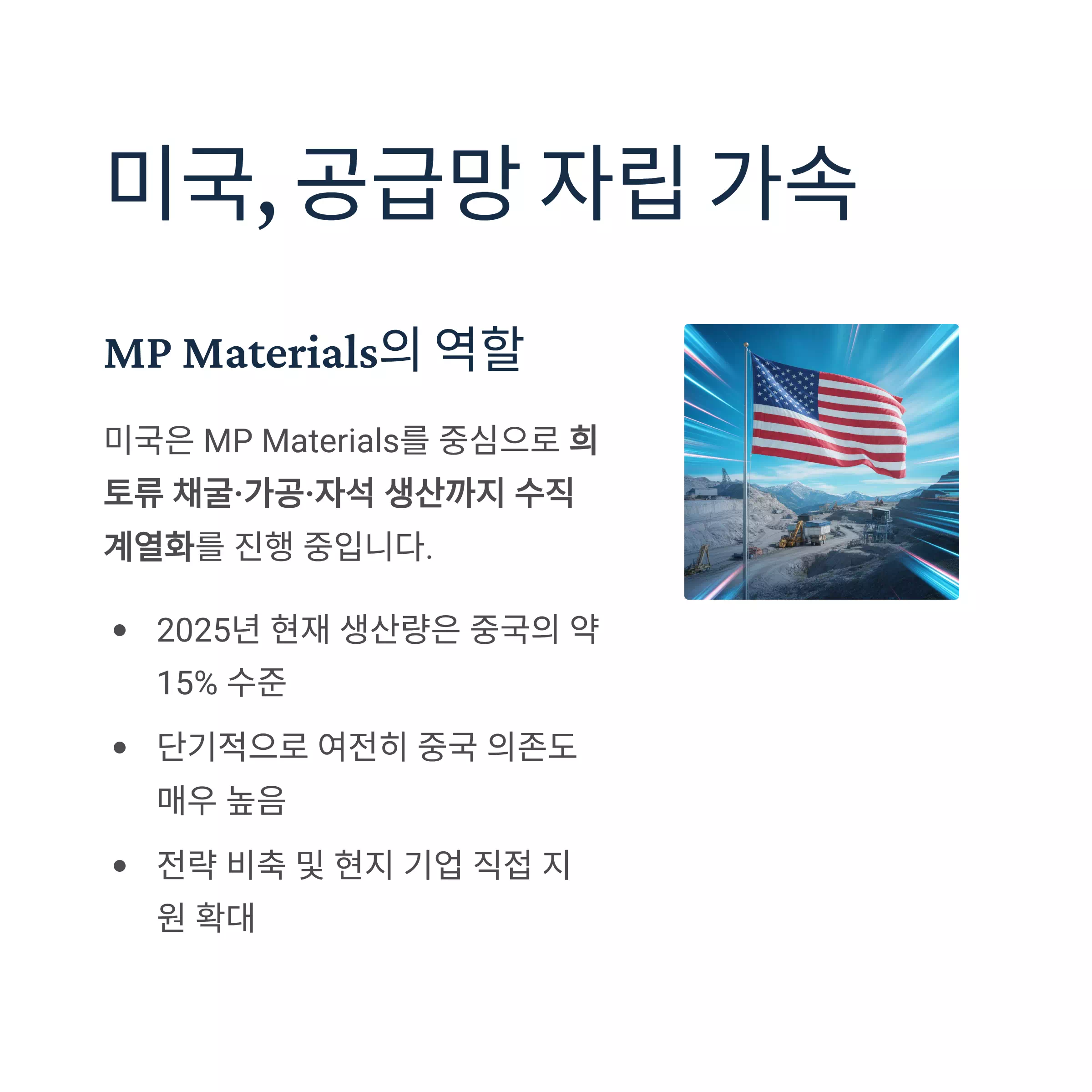미국은 MP Materials를 중심으로 희토류 채굴·가공·자석 생산까지 수직계열화를 진행 중이지만,