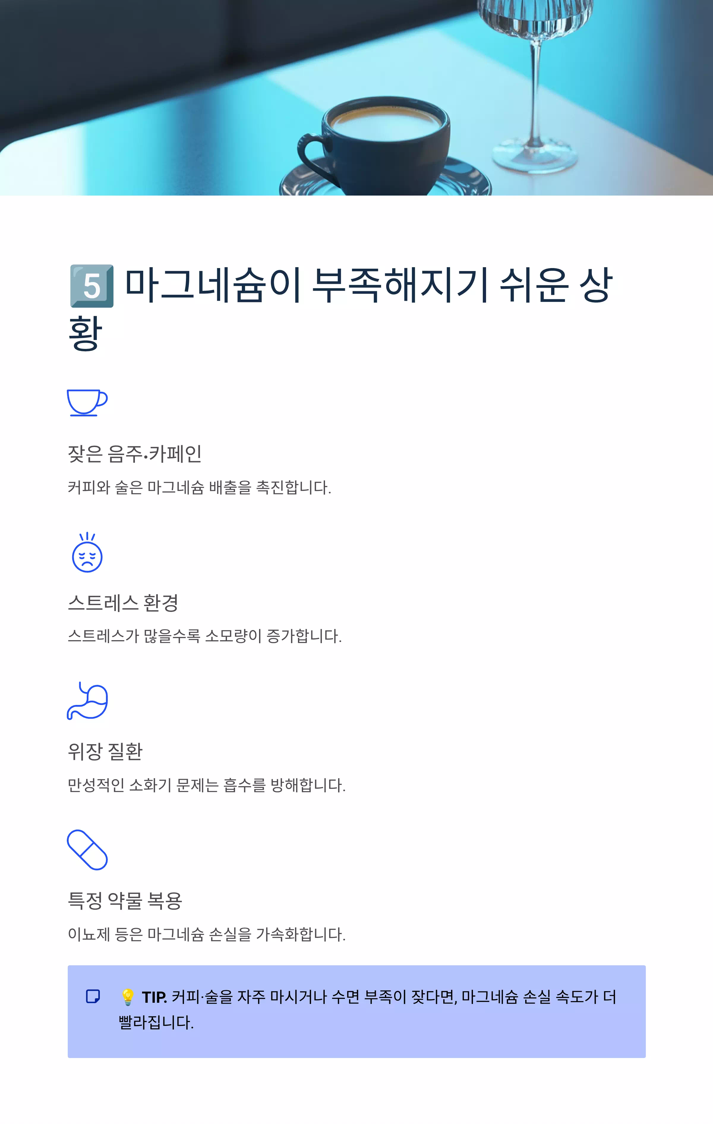 💡 TIP. 커피·술을 자주 마시거나 수면 부족이 잦다면, 마그네슘 손실 속도가 더 빨라집니다.