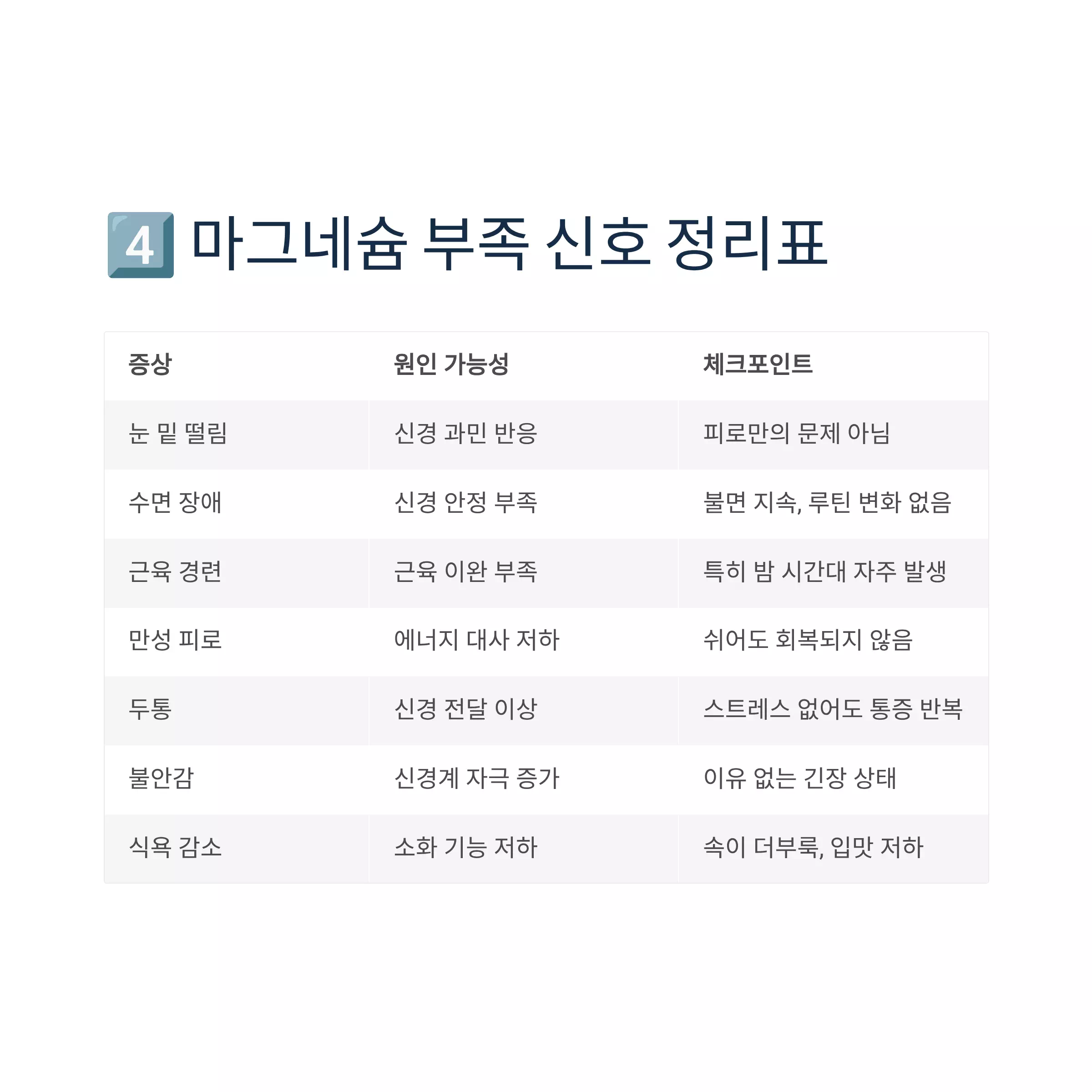 4️⃣ 마그네슘 부족 신호 정리표