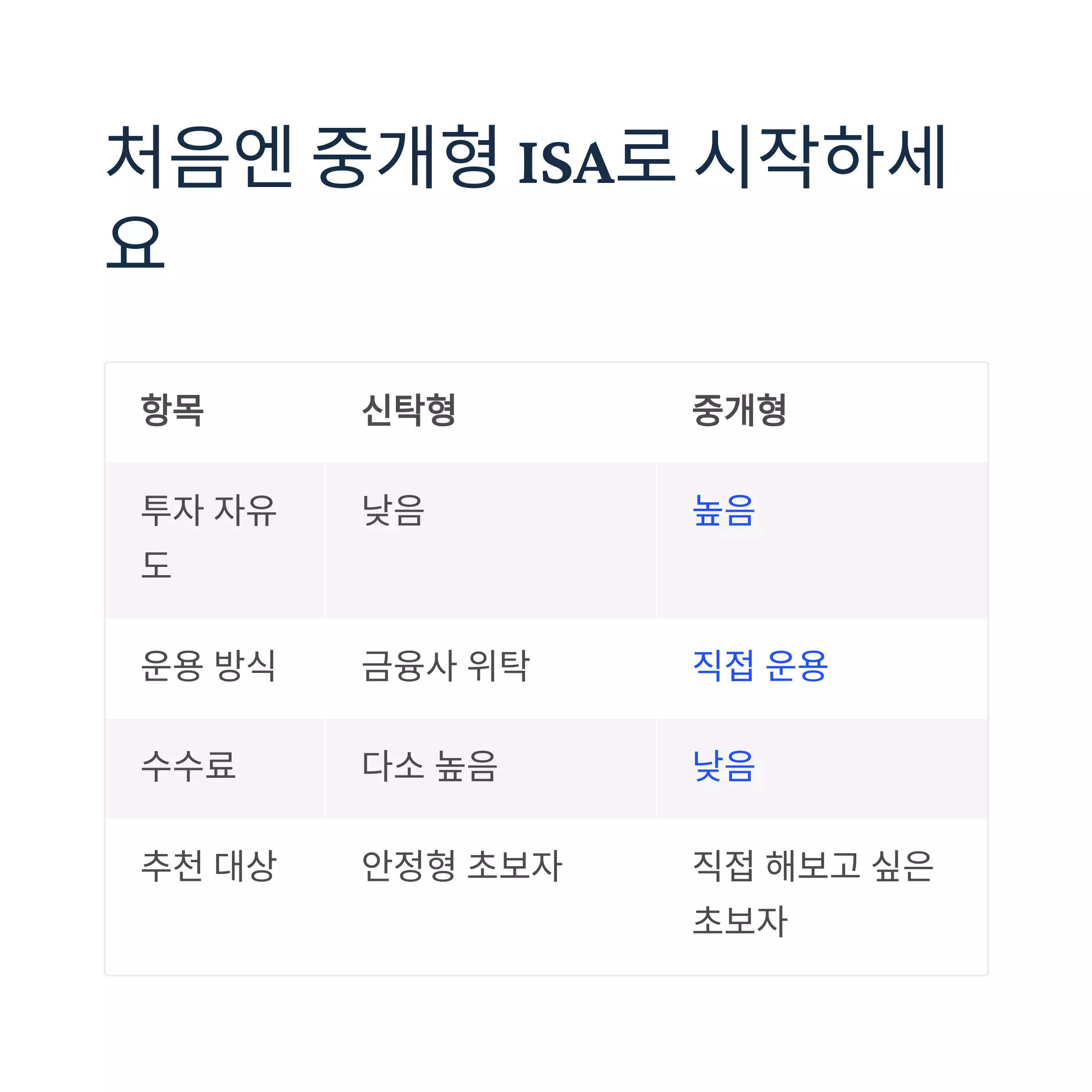 ISA에는 신탁형과 중개형이 있는데, 사회초년생에게는 중개형 ISA가 훨씬 유리해요.