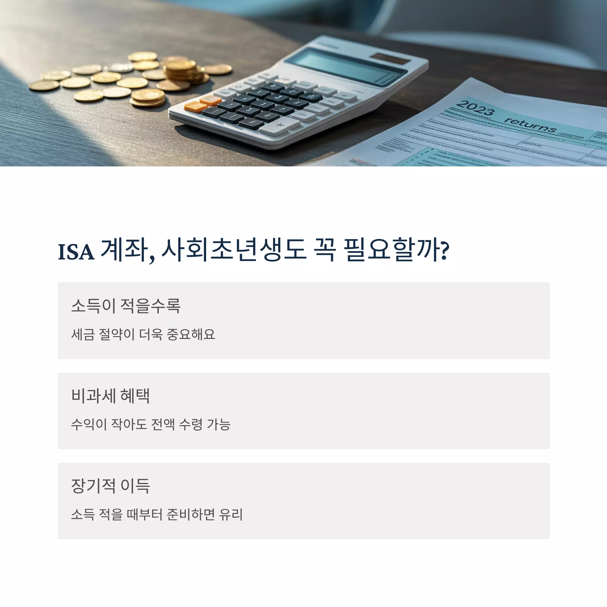 ISA는 비과세 혜택으로 수익이 작아도 전액 수령이 가능하니, 소득이 적을 때부터 준비해두면 장기적으로 큰 이득이 됩니다.