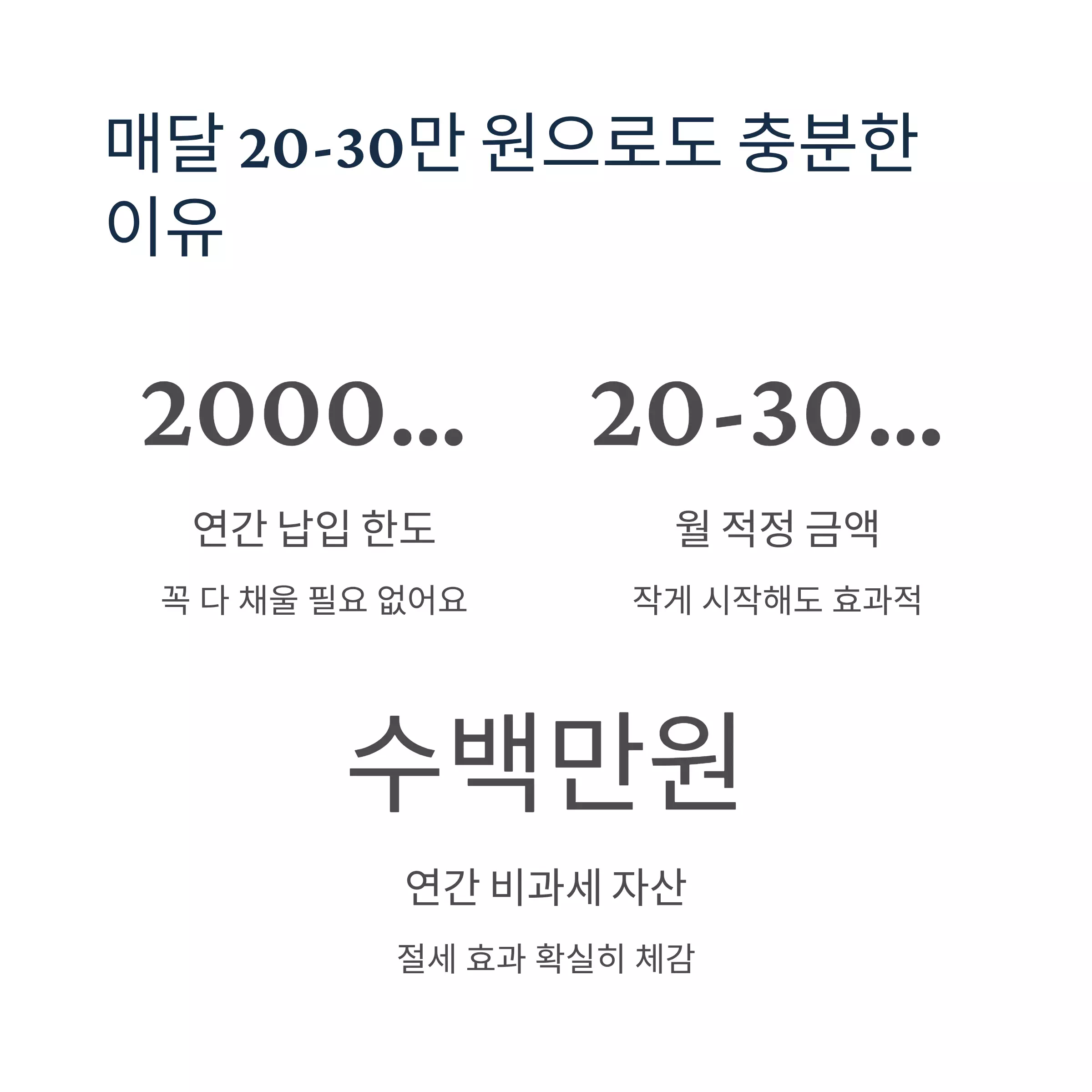 월 20~30만 원만 넣어도 연간 수백만 원의 자산을 비과세로 쌓을 수 있습니다.