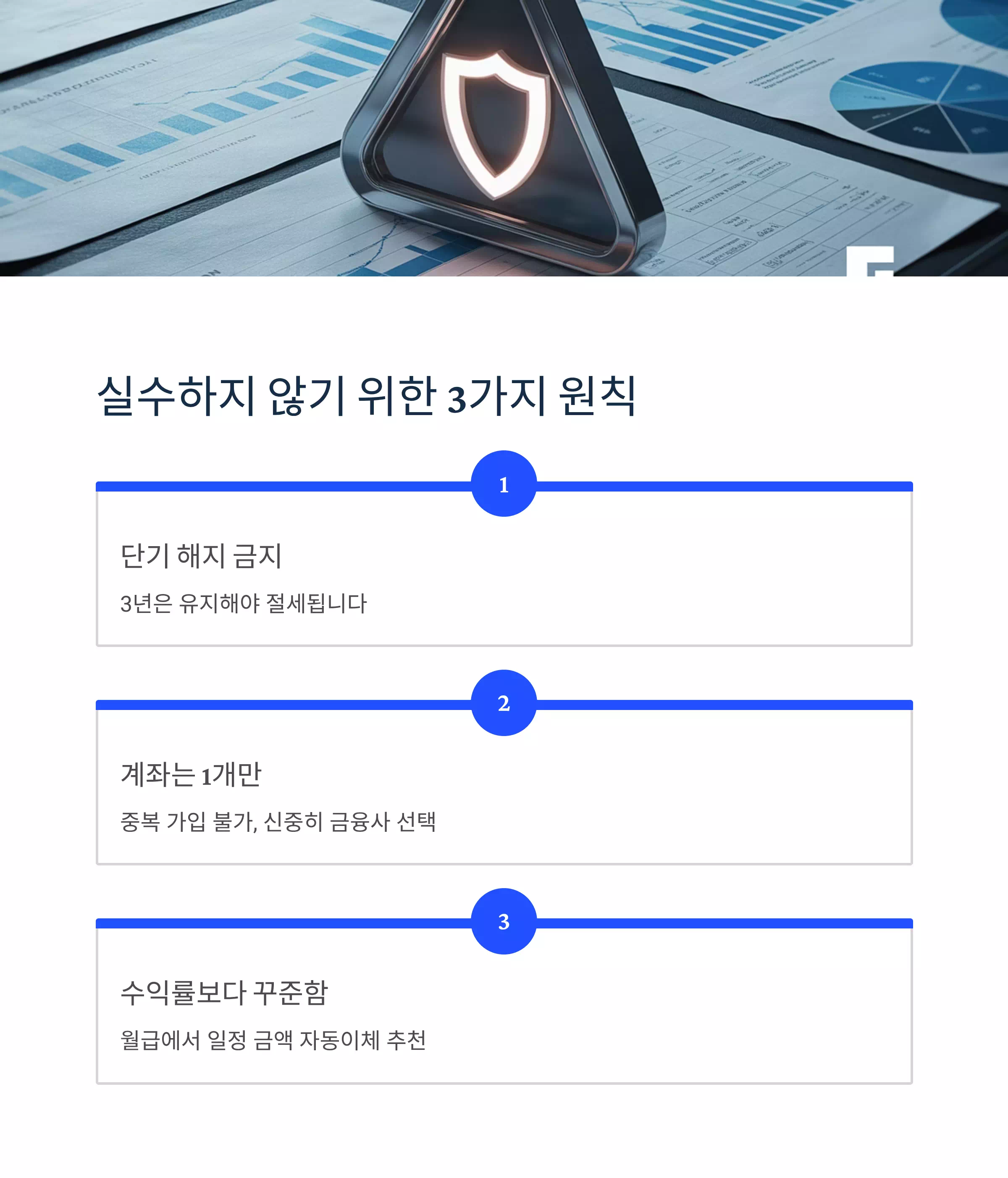 - 단기 해지 금지: 3년은 유지해야 절세됩니다.