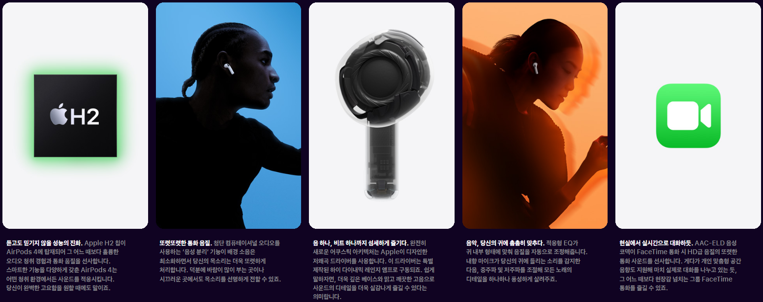 - 노이즈 캔슬링: 더 나은 음악 감상을 위해서는 필수 기능이겠죠? 외부 소음을 완벽하게 차단해주는 에어팟4의 노이즈 캔슬링은 많은 매력을 가지고 있어요.