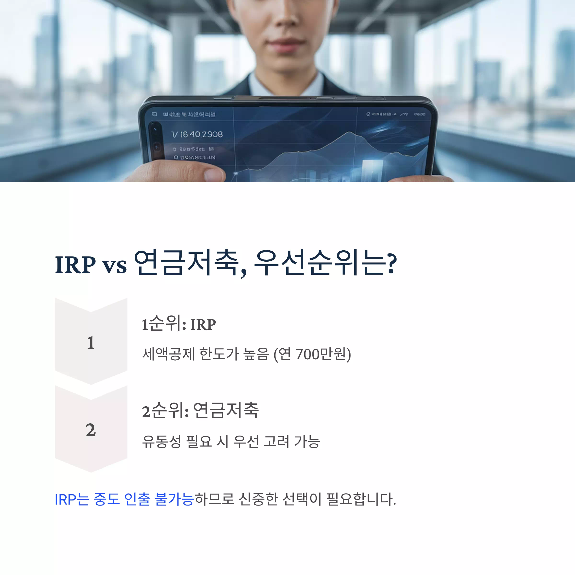 세액공제 한도가 높은 IRP를 먼저 채우고, 이후 연금저축을 활용하는 전략이 일반적입니다. 다만 IRP는 중도 인출이 불가능하므로, 유동성이 필요하다면 연금저축을 우선 고려할 수도 있습니다.