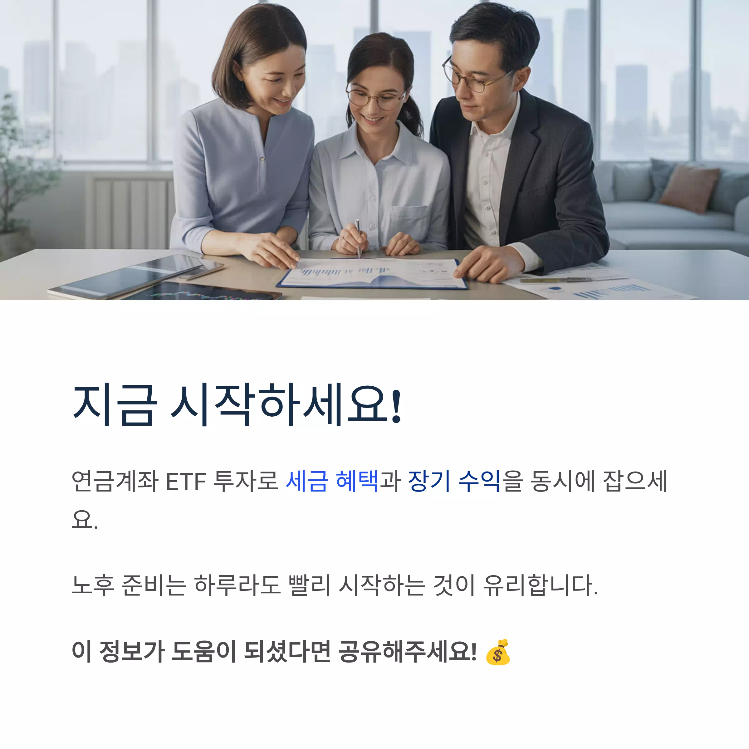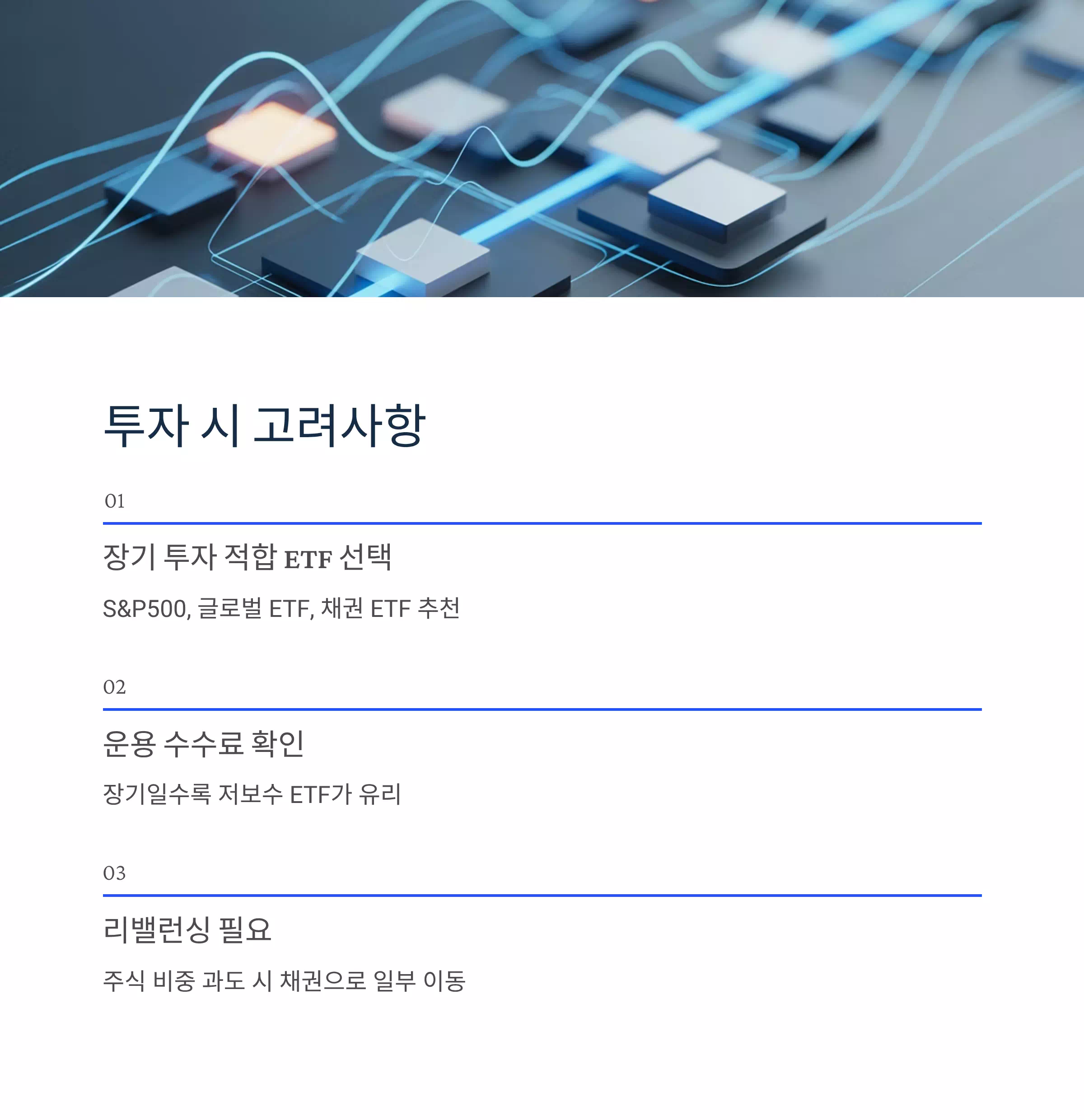 - 장기 투자 적합 ETF 선택 → S&P500, 글로벌 ETF, 채권 ETF