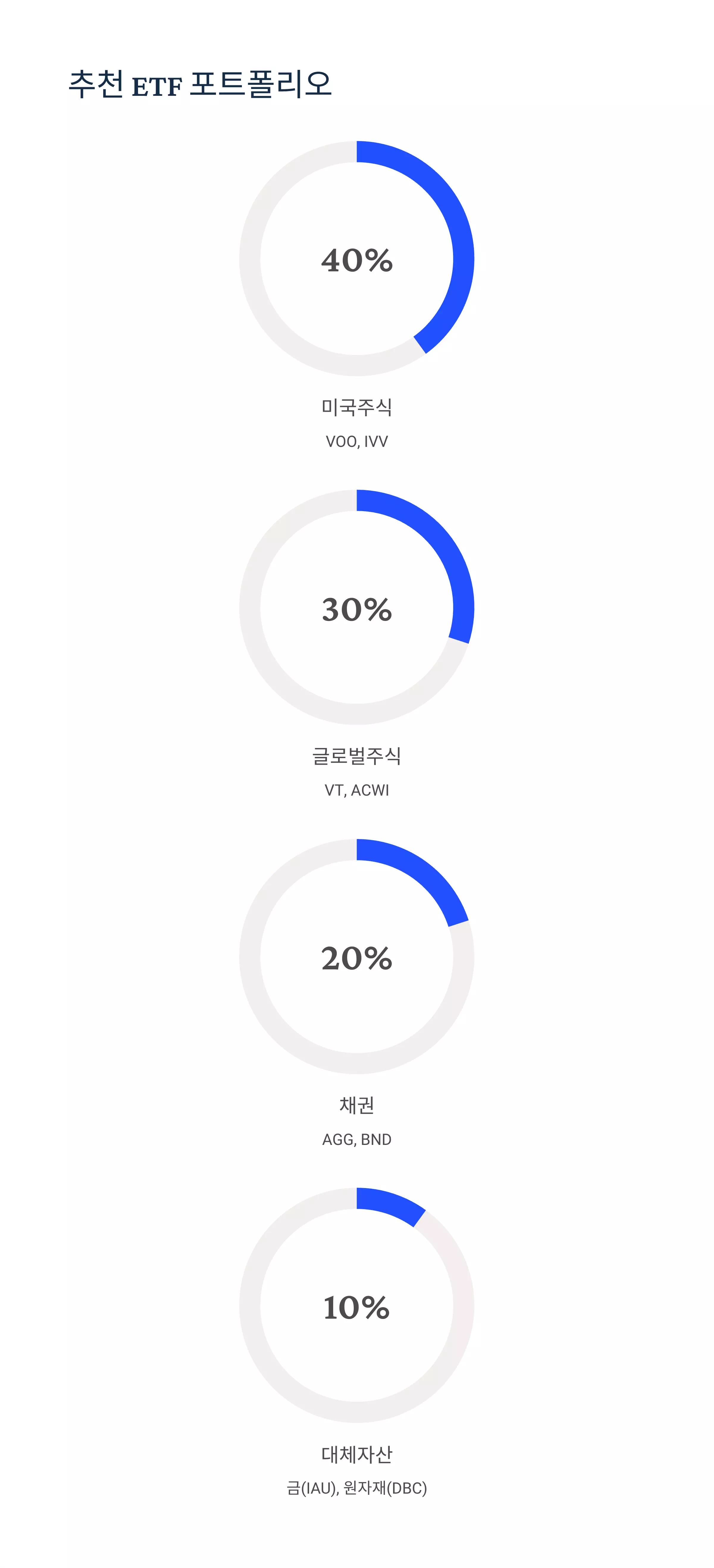 | 대체자산 | 금(IAU), 원자재(DBC) | 10% |