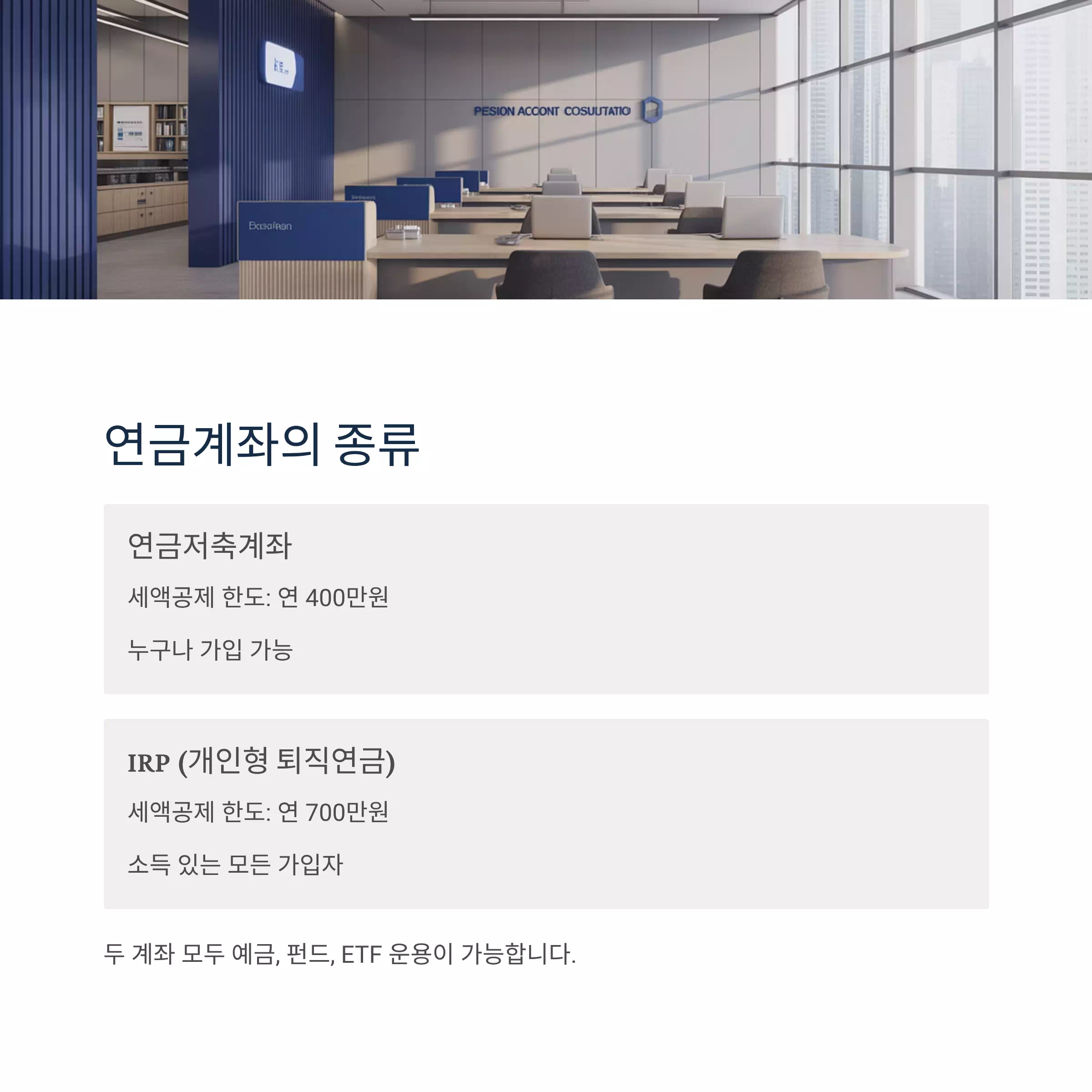 연금계좌는 크게 연금저축계좌와 퇴직연금(IRP)으로 나뉩니다. 두 계좌 모두 노후 자산 운용을 지원하며, ETF 같은 실적 배당형 상품도 운용 가능합니다.