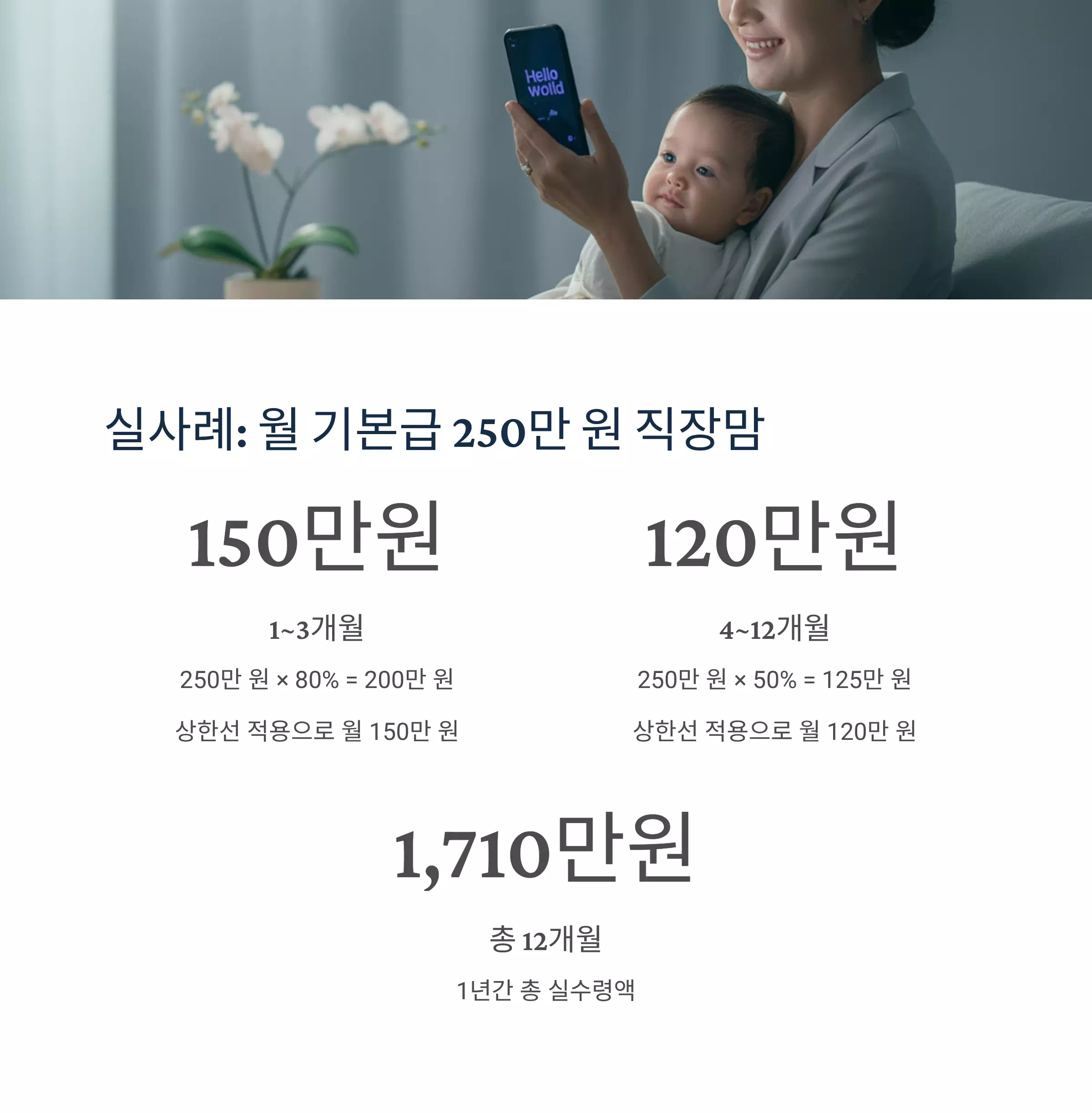 | 1~3개월 | 250만 원 × 80% = 200만 원 | 월 150만 원 (상한선 적용) |