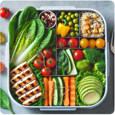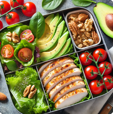 - 도시락 용기에 샐러드 채소, 아보카도, 닭가슴살을 담고, 그 위에 견과류를 뿌려줍니다.