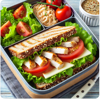 - 재료: 통밀빵 2조각, 닭가슴살 50g, 샐러드 채소 30g, 토마토 1개, 슬라이스 치즈 1장, 마요네즈 1큰술