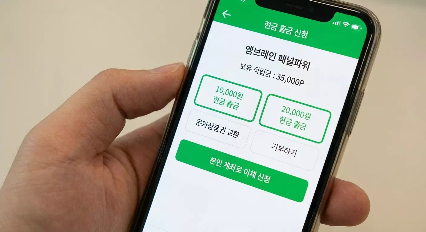 엠브레인 패널파워는 설문 적립금이 누적 10,000원 이상일 때부터 현금 이체가 가능하며, 10,000원을 기준으로 10,000원 단위(10,000·20,000·30,000원 등)로 출금 신청하면 1~2일 이내 본인 명의 계좌로 입금됩니다.