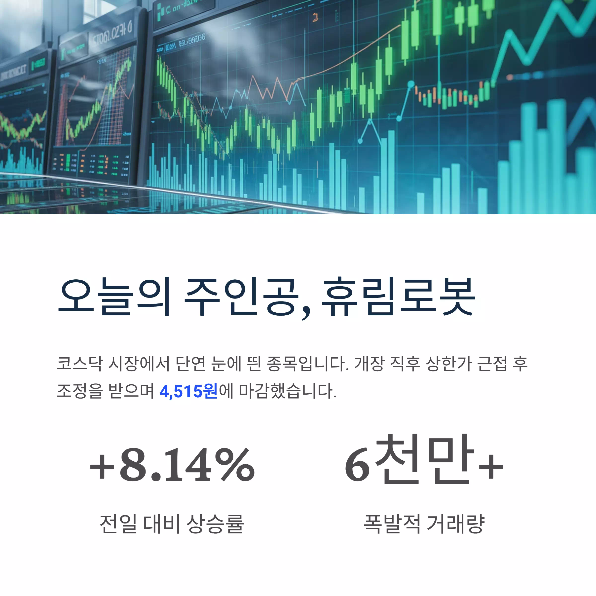 오늘 코스닥 시장에서 단연 눈에 띈 종목, 바로 ‘휴림로봇’입니다. 개장 직후 강하게 치고 올라 상한가에 근접한 뒤 조정을 받으며 4,515원에 마감했습니다. 전일 대비 8.14% 상승, 거래량은 6천만 주 이상으로 폭발했습니다. 그 배경에 무엇이 있었는지, 그리고 단순한 일회성 급등인지 함께 짚어보겠습니다.