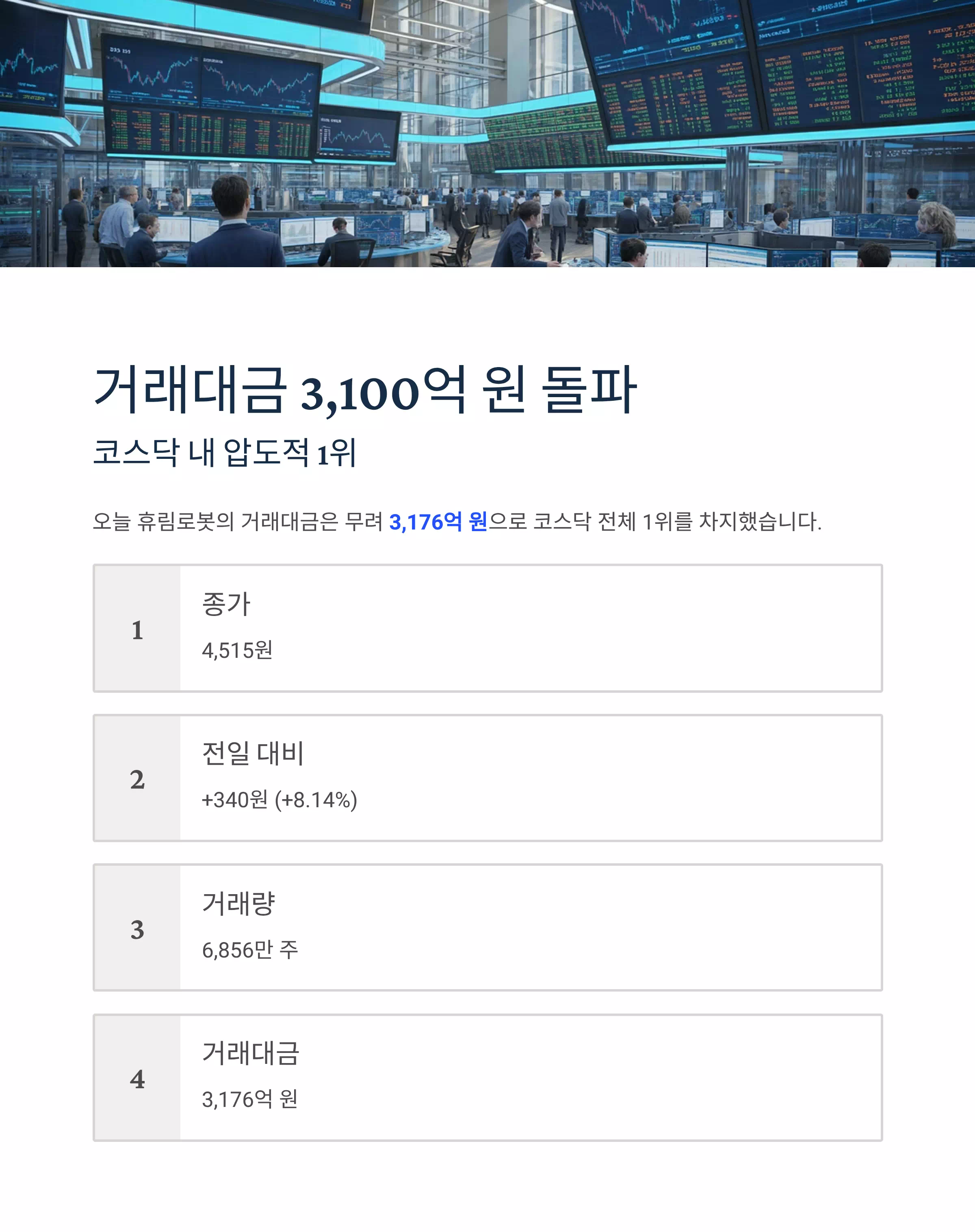 오늘 휴림로봇의 거래대금은 무려 3,176억 원으로 코스닥 전체 1위를 차지했습니다. 단일 종목에 이 정도의 자금이 하루 만에 쏠렸다는 건, 단순한 테마성 해프닝이 아니라는 의미입니다.