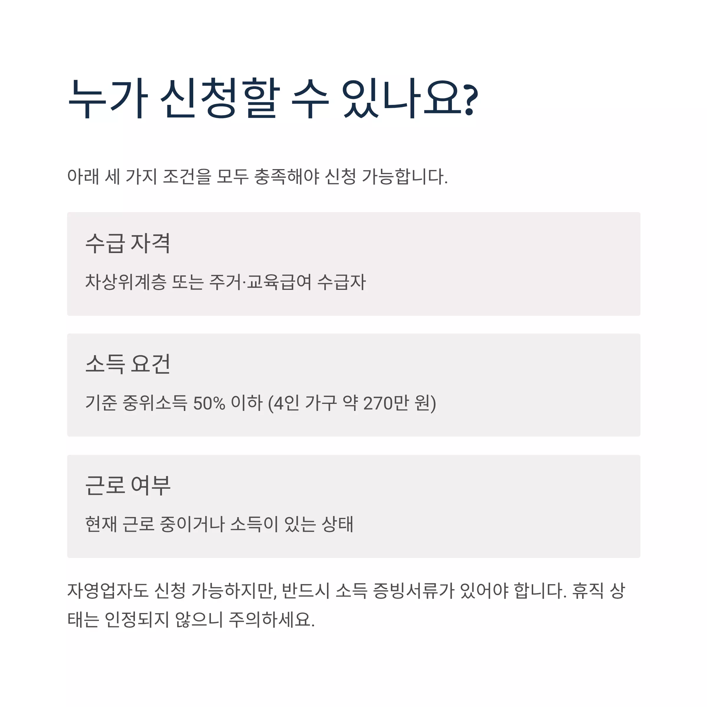 | 소득 요건 | 기준 중위소득 50% 이하 (4인 가구 약 270만 원) |