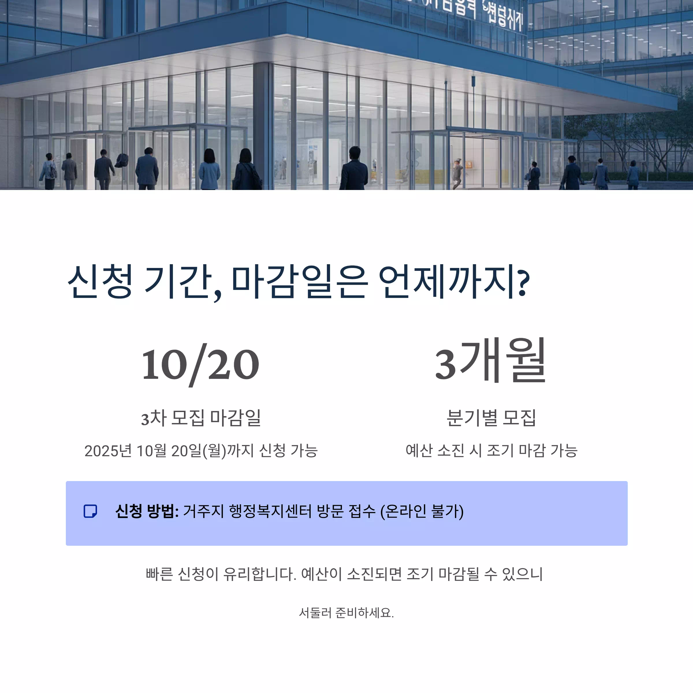 2025년 3차 모집 마감일은 10월 20일(월)입니다. 분기별로 모집이 진행되지만, 예산 소진 시 조기 마감될 수 있으므로 빠른 신청이 유리합니다.