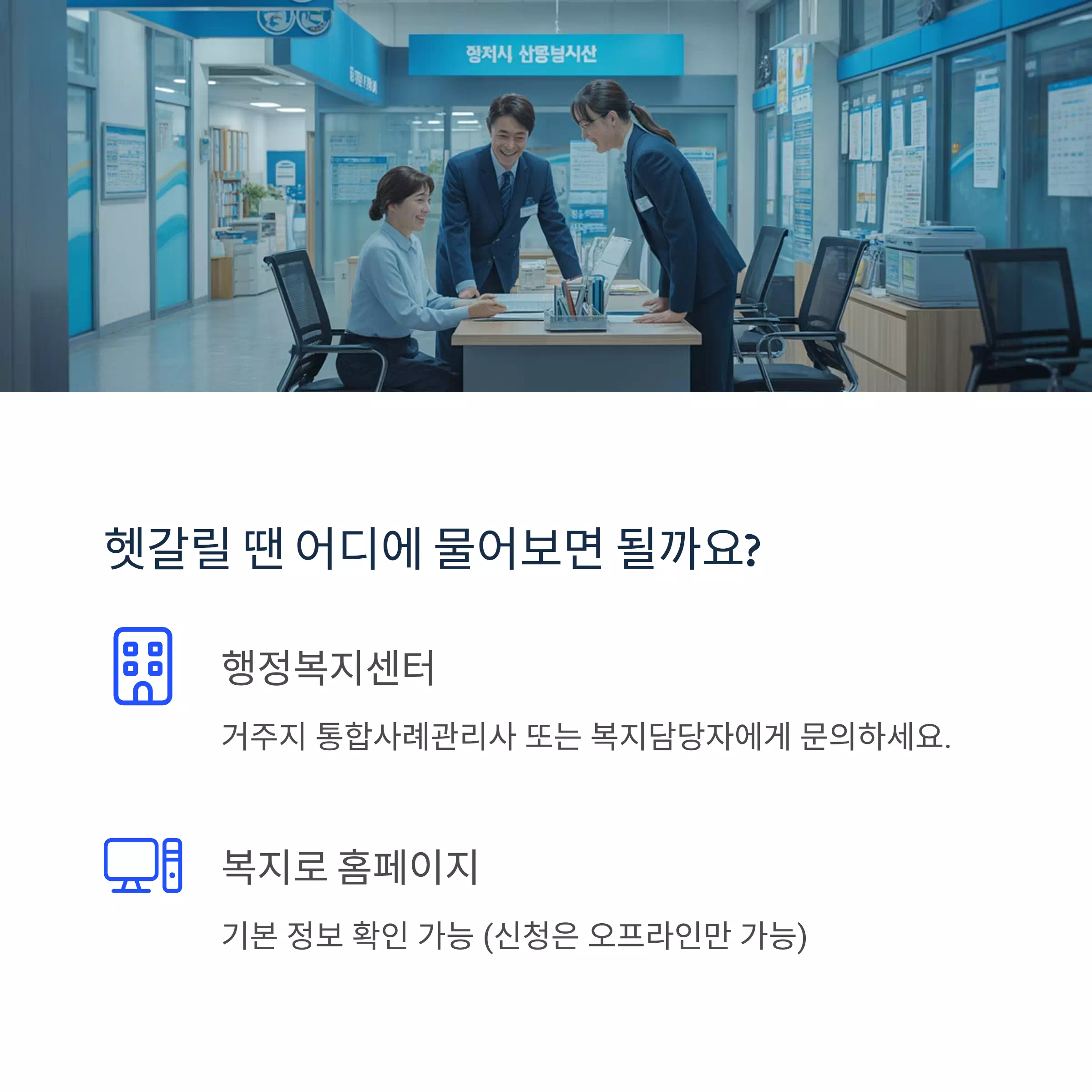 기본 정보는 복지로 홈페이지에서도 확인 가능하지만, 신청 및 서류 접수는 반드시 오프라인으로 진행해야 합니다.