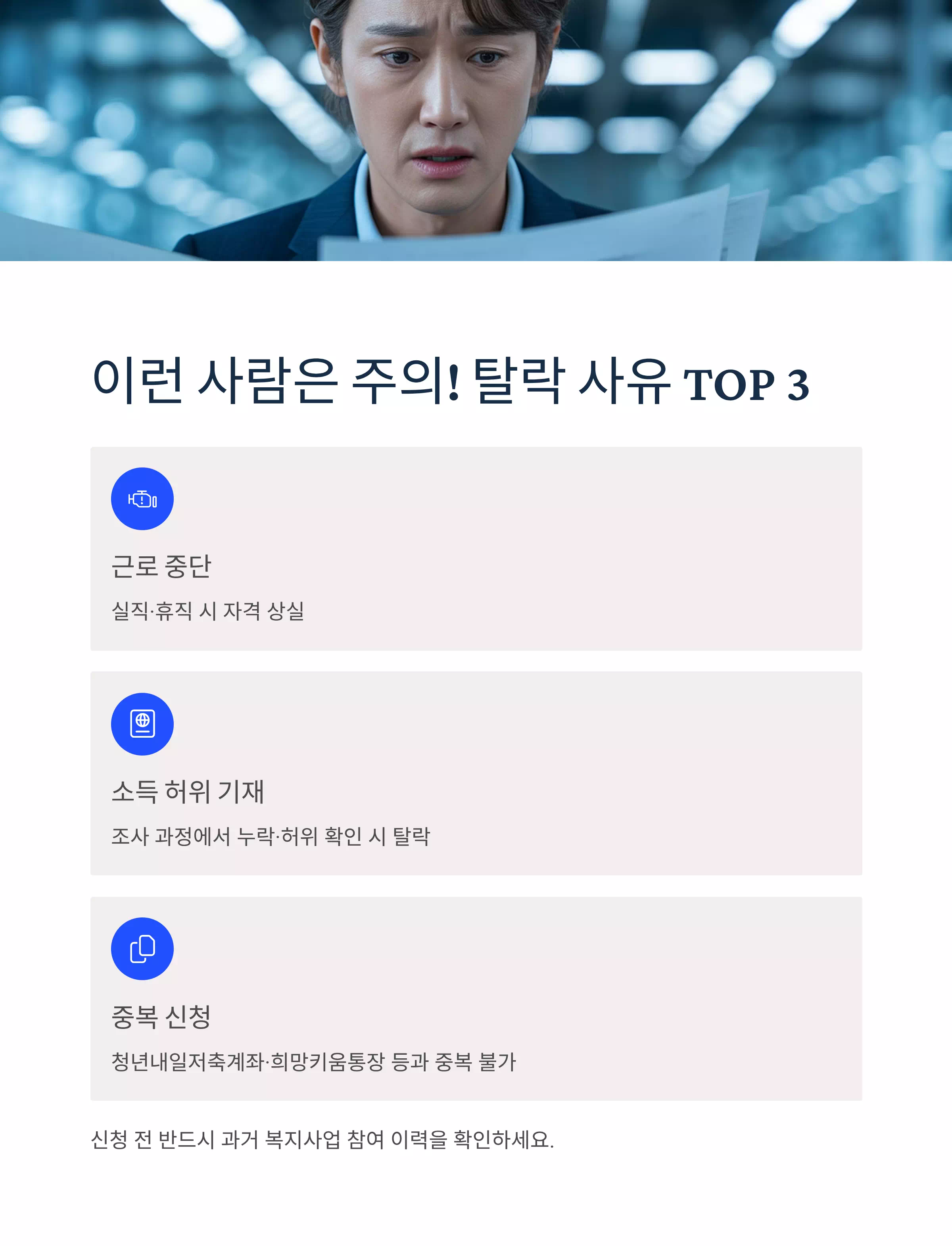 - 소득 허위 기재 — 조사 과정에서 누락·허위 확인 시 탈락