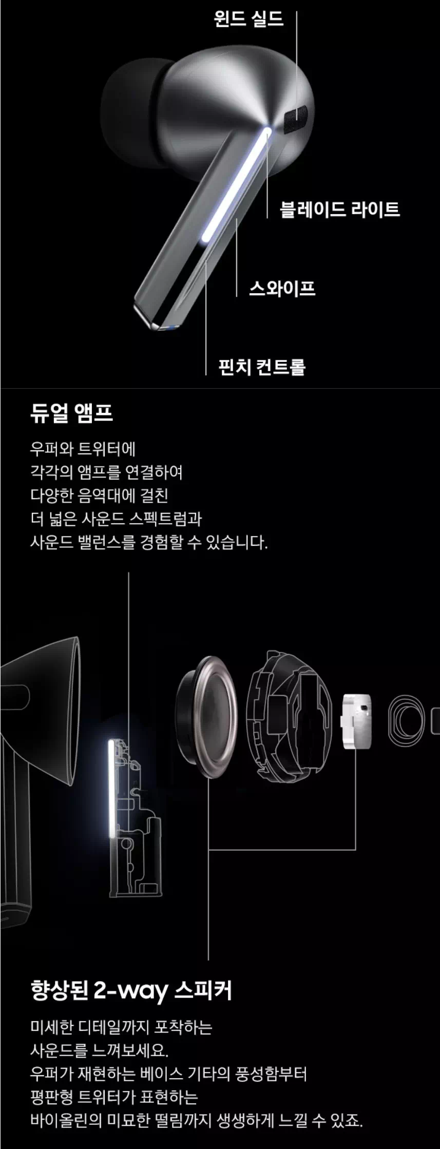 | 코덱 / 사운드 품질 | 24bit 손실 없는 고해상도 지원 (삼성 기기 연결 시) :contentReference[oaicite:9]{index=9} | Adaptive EQ + 스페이셜 오디오 지원. :contentReference[oaicite:10]{index=10} |