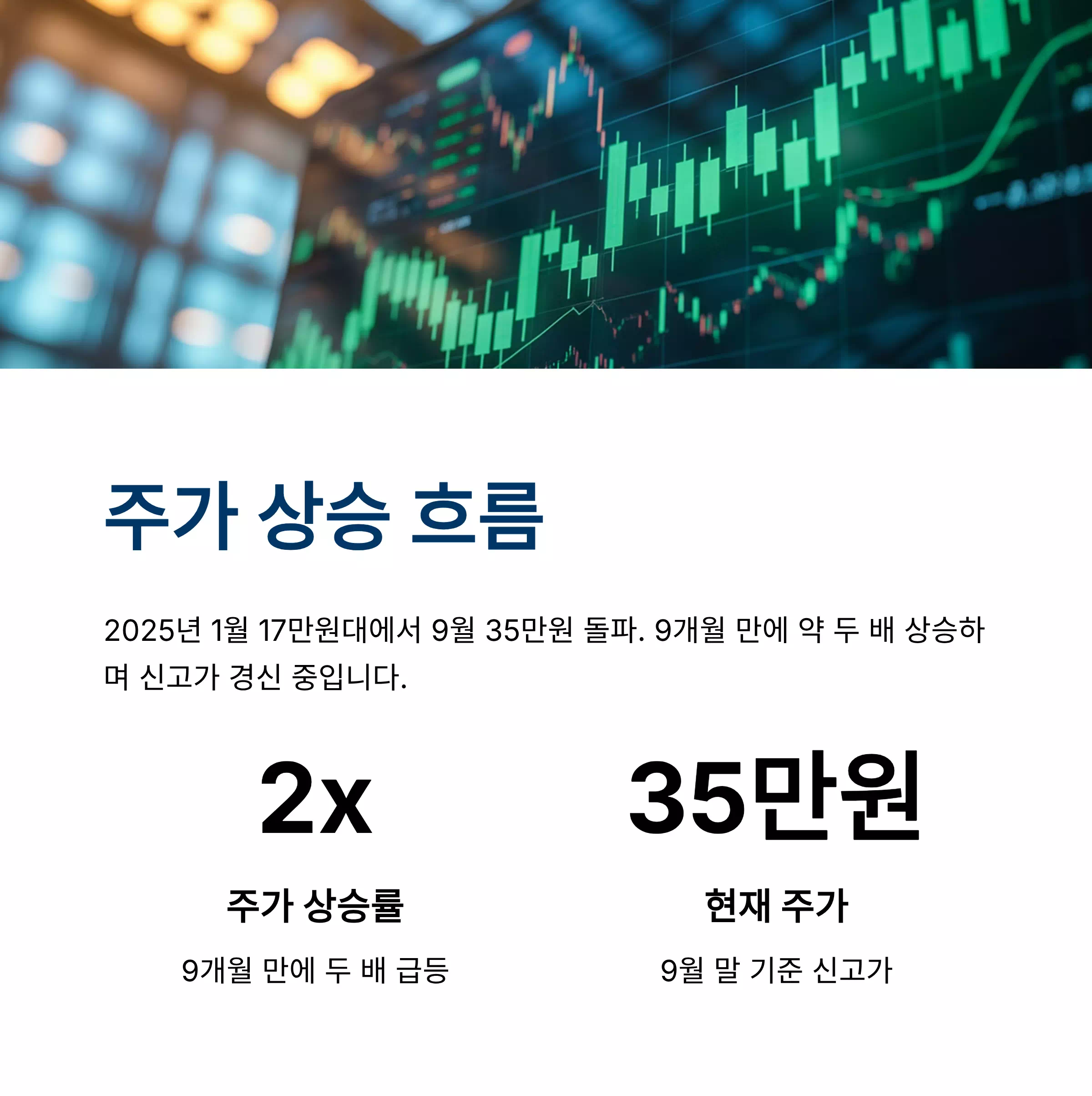 2025년 1월 초 17만 원대에서 9월 말 35만 원을 돌파하며 약 두 배 상승했습니다. NH투자·IBK·SK증권 등 주요 리포트에서 3분기 최대 실적과 목표가 상향을 발표했죠.