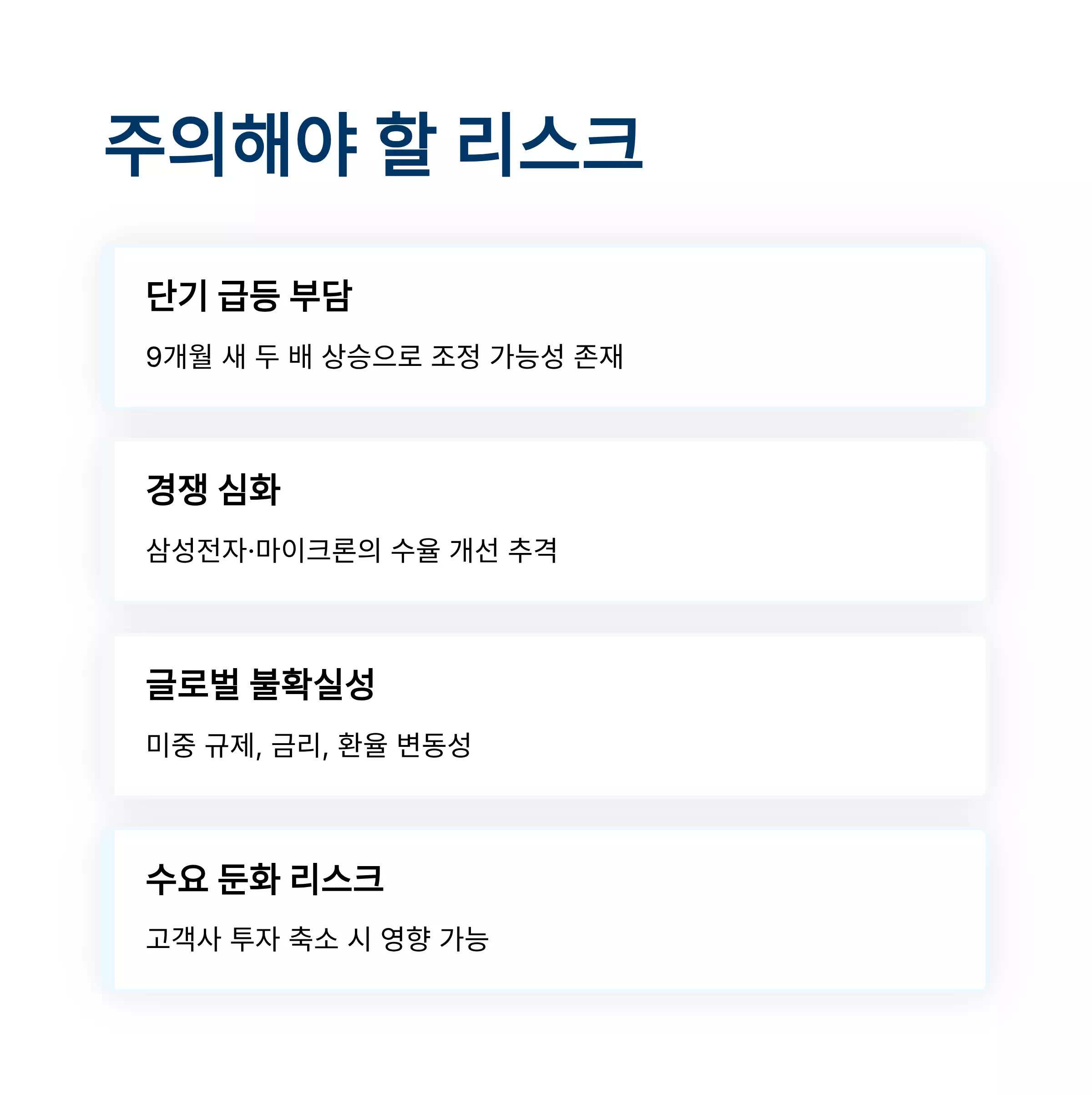 - AI 수요 둔화 리스크: 고객사 CapEx 축소 시 영향 가능