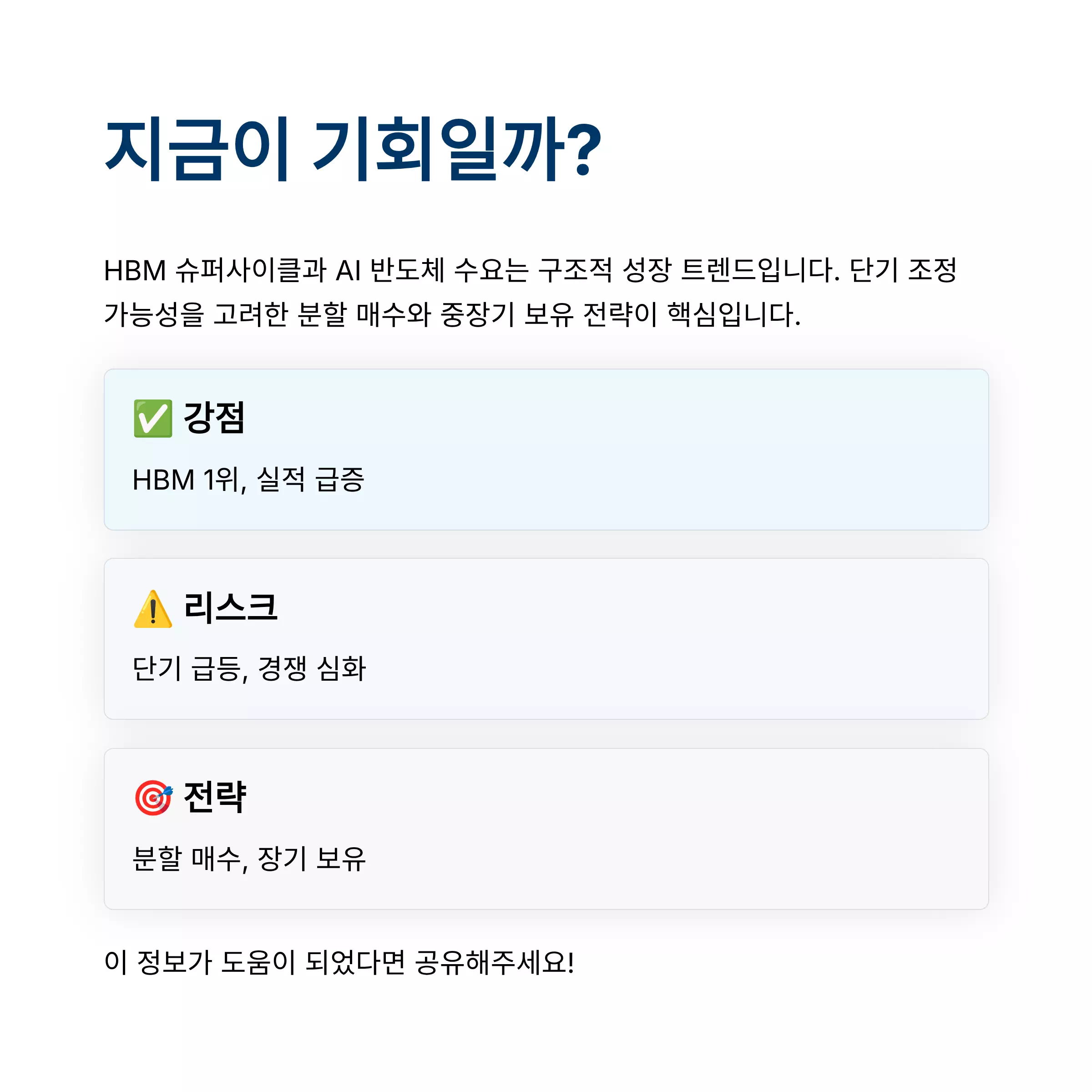 따라서 증권가에서는 “분할매수 및 장기보유” 전략을 권장합니다. 중장기적으로는 HBM4 양산, AI DRAM 신제품 출시가 다음 상승 모멘텀이 될 전망입니다.
