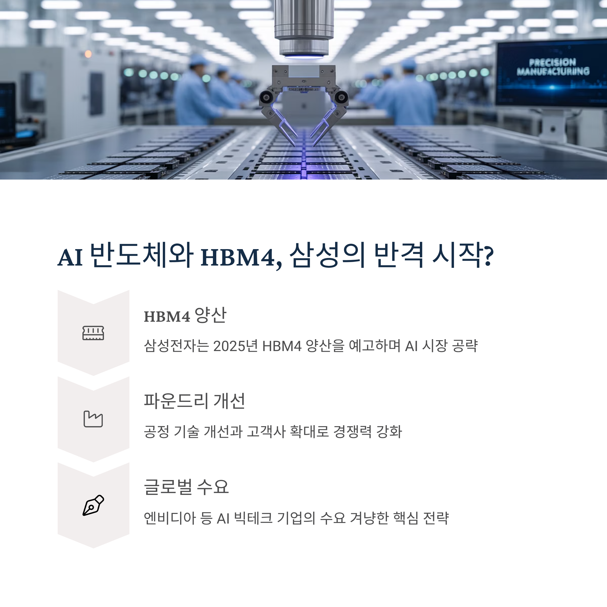 삼성전자는 2025년 HBM4 양산을 예고하고 있으며, 이는 엔비디아 등 글로벌 AI 빅테크 기업의 수요를 겨냥한 핵심 전략입니다.