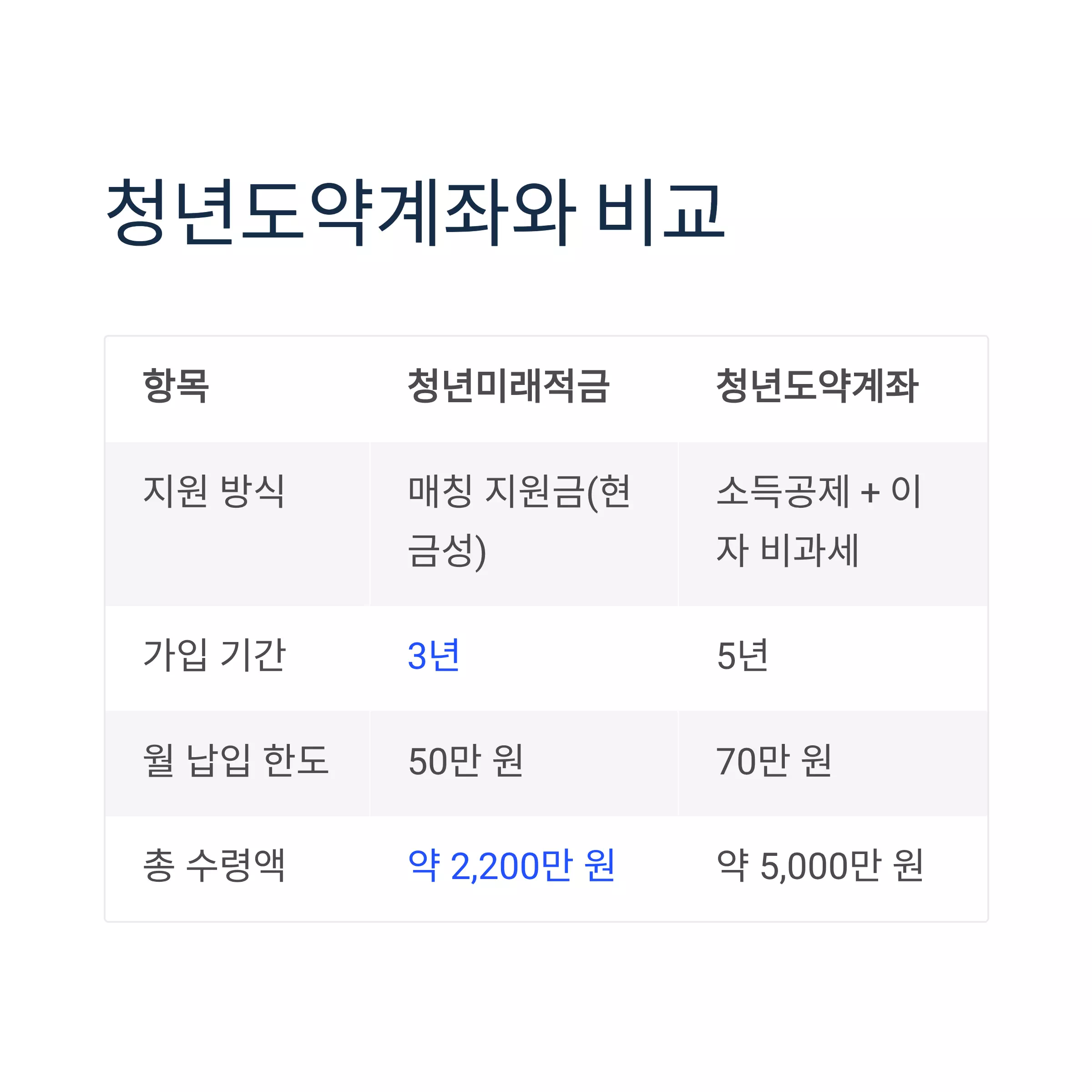 | 총 수령액 | 약 2,200만 원 (우대형) | 약 5,000만 원 |