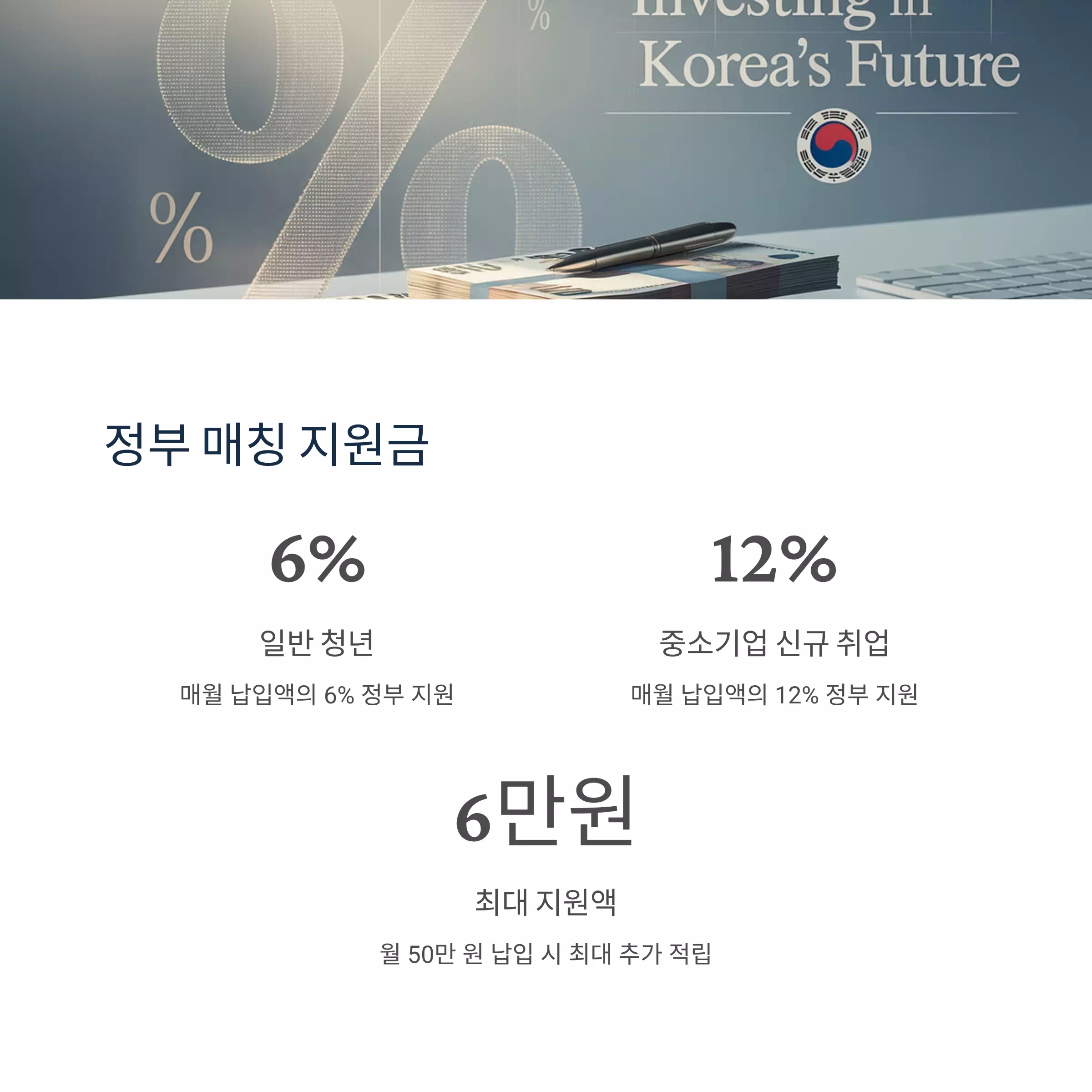 단순히 은행 이자를 받는 것이 아니라, 정부 예산으로 본인 납입금의 일정 비율을 매칭 지원해줍니다.