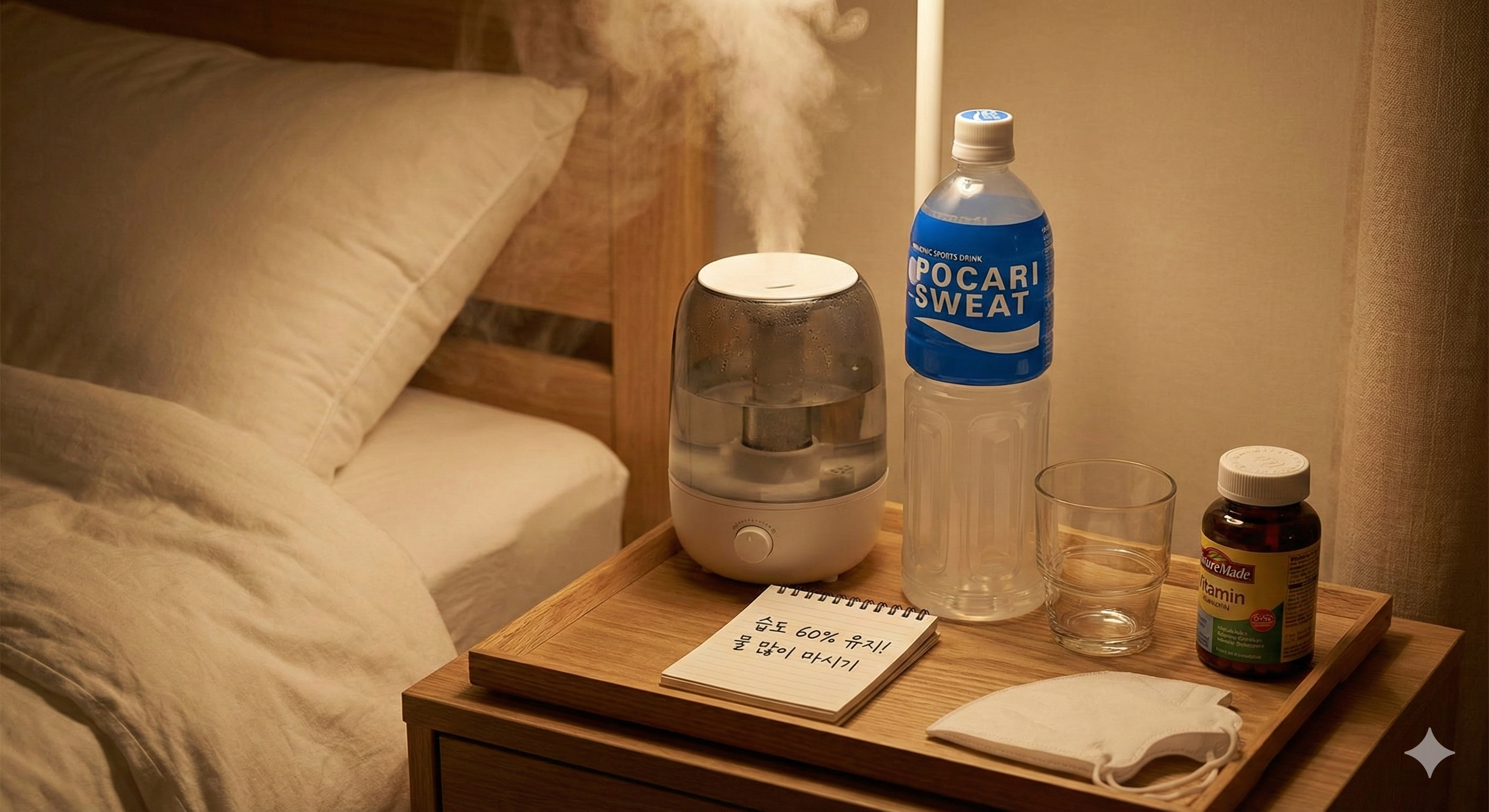 건조하면 기침 때문에 잠을 못 자거든요. 가습기 습도 60% 무조건 맞추세요.