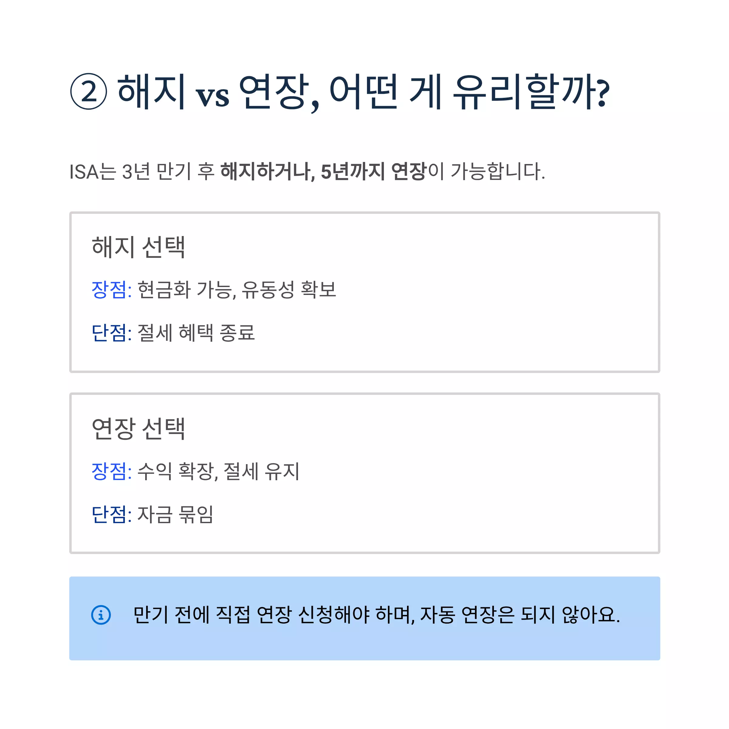 | 연장 | 수익 확장, 절세 유지 | 자금 묶임 |